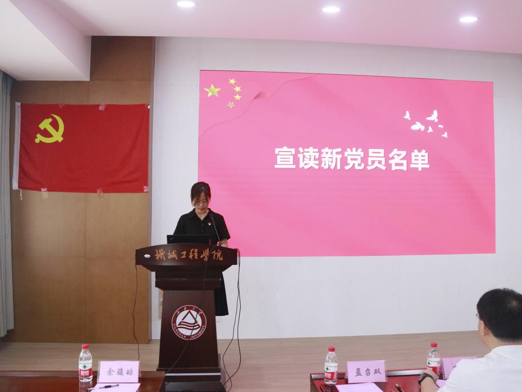伴随着庄严的《国际歌》,仪式正式开始。孟召双宣读本学年发展的73名新党员名单并表示祝贺,她希望他们在今后的学习生活中进一步发挥党员的先锋模范作用。潘智琦带领新党员宣读入党誓词,激昂的宣誓表明了党员们对党忠诚的决心。新发展党员代表徐冉冉发言,她表示入党是一份光荣,更是一份责任,她代表新同志们作出庄重承诺:会坚定不移跟党走,把忠诚书写在党和人民的事业中,同时加强理论武装,坚定理想信念,不断提高专业能力,投身党和国家的建设中。