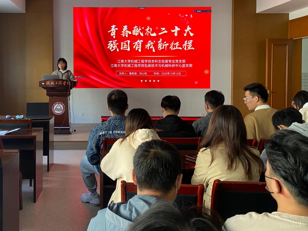 首先,主持人带领党员们学习了“中国共产党历次全国代表大会”精神,重温党的光辉历程,学习党的伟大精神,传承党的奋斗基因。接着,现场党员通过“忆百年”激光雕刻工艺作品赏析环节,分享作品背后的党史故事,以传承红色基因、赓续红色血脉。包装技术与机械科研中心党支部党员张佳伟以“强国有我在,奋进新时代”为主题进行现场演讲,号召大家积极发挥党员先锋模范作用;本科生包装工程专业党支部党员周馨媛以“我心向党,逐梦青春”为主题进行线上朗诵,展示了机械青年党员的朝气与理想。互动交流环节中,与会党员结合本次学习内容,结合实际,踊跃发言。李淦表示,作为研究生党员,我会脚踏实地,认真科研,不断提升自己的专业才识,为国家富强,为民族复兴做出贡献。