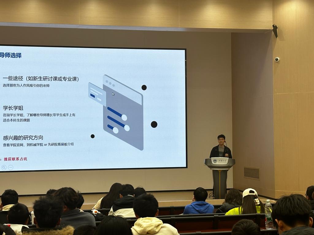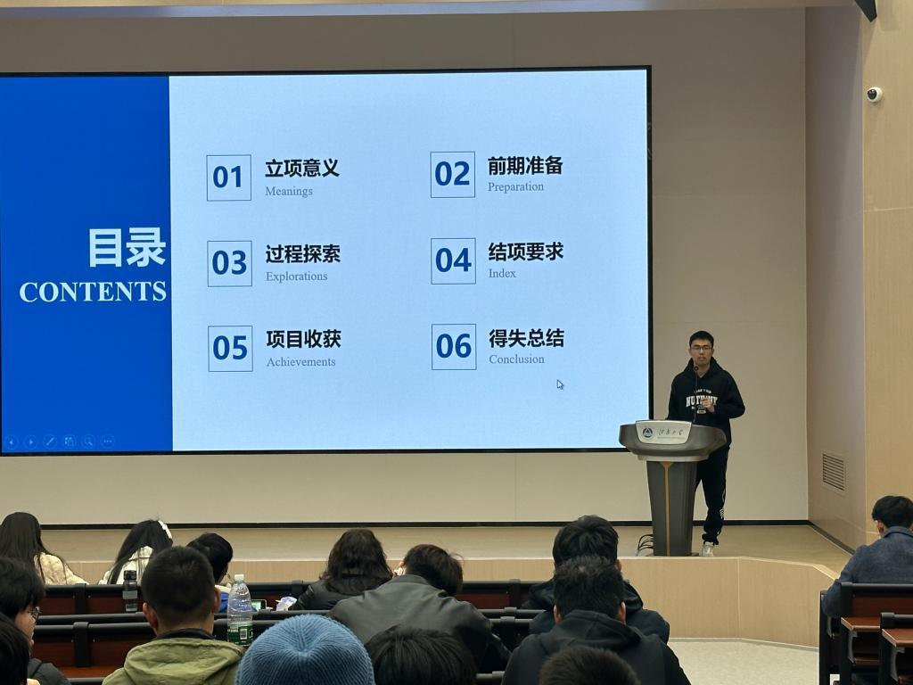 为推动2024年大学生创新创业项目申报工作的顺利开展,帮助同学们熟悉大创申报流程和更好的完成项目,星空xk官方网于11月27日晚在1C109举行了大学生创新创业训练经验分享会。此次分享会由机电2001班姚亚周同学和机械2104班陈道明同学主讲,辅导员张倩瑶及100余名2022级本科生参与了此次分享会。