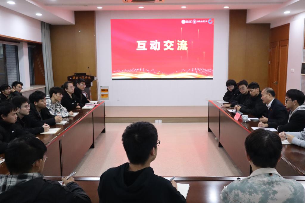 课前,团支部副书记孙崇皓同学围绕思想与学风建设、学科竞赛与科研团队、志愿活动与社会实践等方面介绍团支部建设情况。一组组数据,一沓沓证书、一张张活动照片都是团员青年践诺“厚德求实,博学践行”院训的生动实践。顾正彪认真听取汇报,肯定了团支部的建设成绩,鼓励机械学子以永攀高峰的干劲在专业学习、学科竞赛、文体活动等方面实现更高层次的突破。现场同学们踊跃发言,交流在学生涯规划、个人发展方面的困惑,顾校长结合自身科研与工作经历为同学们答疑解惑,探讨互动中同学们表示收获颇丰。