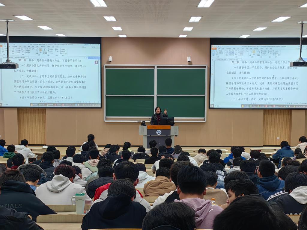 沈贤从学籍管理、重修选课、培养方案三方面为各年级年级进行了详细解读,她现场演示选课页面,指导学生熟练使用教务系统,重点提醒同学们仔细阅读培养方案,关注教务处官网的选课教学信息,注意时间节点,避免错选、漏选。辅导员潘智琦、何涛针对不同类别毕业意向学生从升学、就业、留学、入伍等方面分类开展分类具体指导;余骏皓、刘子琪、高鑫面向大三学生就不同专业往届毕业生去向进行解读分析,助力学生规划未来;张倩瑶、宋京姝面向大二学生讲解了创新创业训练学分与第二课堂学分认定政策,鼓励同学们新学期发扬良好学风,互帮互助,共同进步;萧欣彤着重强调了在大一打好高数、物理、英语等基础课程的重要性,鼓励同学们保持体育锻炼,注意自身情绪波动,懂得及时求助、学会自我调节。
