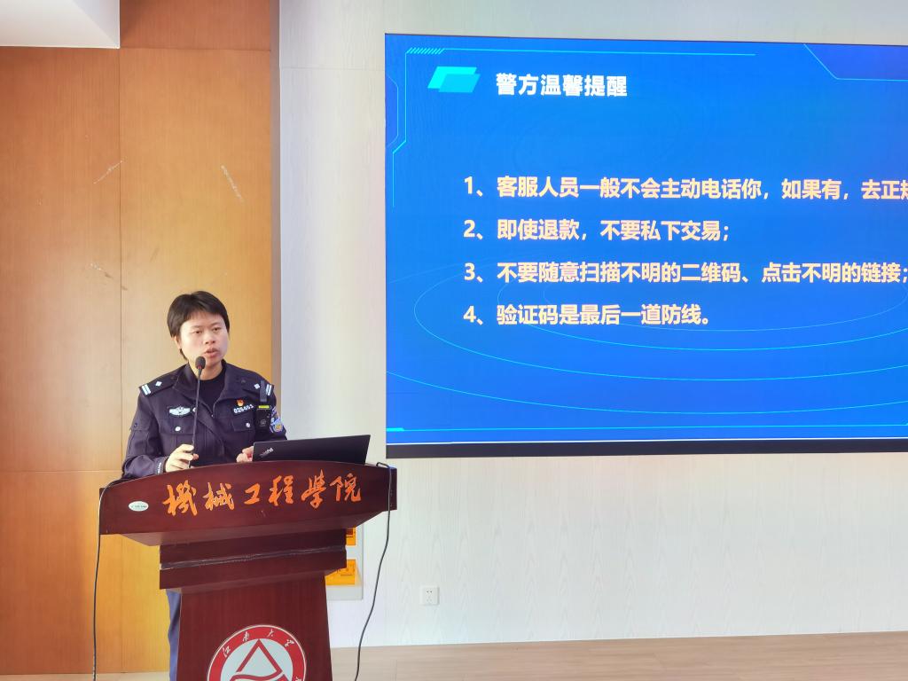 随后进行的“大学生防范电信网络诈骗”专题反诈教育讲座中,董蕾警官向学生介绍了电信诈骗的惯用手段与常见形式。她以近几年发生的校园受骗案件为例,展示了网购退款、游戏装备交易、线下交易以及刷单等四类高频诈骗的危害性,深入浅出地向学生解析了诈骗分子惯用的诈骗方式、流程和作案特点,为同学们总结了多种应对方法,叮嘱同学们要时刻增强对个人信息的保护,切实增强识骗、防骗、拒骗的安全意识。